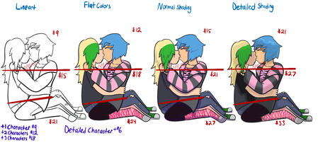 Headshot: $10-$22Half Body: $16-$28Full Body: $22-34Detailed Character: +$8+1 Character: +$9